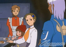 When the peace is shattered by Zeon mobile suits, and she loses her family before her eyes, she panics, but Amuro leads her to refuge on the Federation ship White Base. Onboard, she creates her own (← adorable) uniform, and takes charge of caring for the ship’s wounded and ill, and war orphans Katz, Letz, and Kikka, as well as Amuro.