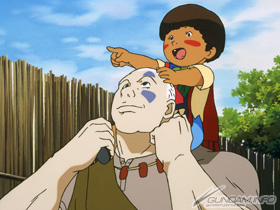 Later, left for dead after a battle, his memories are lost and he reappears as a wandering monk. The picture of monastic serenity, he carries on peaceful conversations and soothes children by crafting dolls, until he happens upon a village that has raised a statue to commemorate the ∀ Gundam and his trauma again rises to the surface. After decapitating (!) the (papier-mâché) ∀ Gundam in a burst of rage exceptional even by his own standards, he disappears again. It's not until he sees the "Moonlight Butterfly" nanomachine weapons of the Gundams (∀ and Turn X) that his memories return and he swears loyalty to Dianna. As the Turn X invades Earth, he goes to war against Ghingham's army in a bright-red custom Kapool.