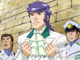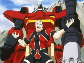 His deep-rooted reaction to Gundams (in fact, he's the first to recognize the ∀ for what it is rather than as the 'White Doll' or simply 'the mustachioed MS') could come from a traumatic memory, or perhaps from imprinting during his long sleep, but in any case manifests itself as (nonsensical) battle cries as he pursue the Gundam.