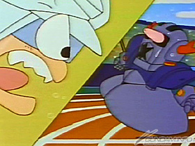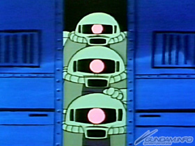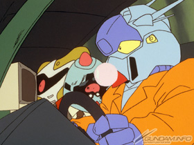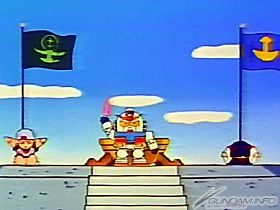 The third part casts Gundam, Zeta, and ZZ characters, humans and robots both, in a massive athletics festival. After the ceremonial torch is lit with a beam saber, we cut to Char's unbiased (!?) commentary in a survival marathon with events like the 50-yard dash or shotput (using Haros!) Sayla's perfect performance in gymnastics gives way to the Zeon National Ballet's finest, an Agguguy in a ribbon who'll drive the crowd wild one way or another... No matter what, you'll never guess what happens next in this episode. It leaps beyond the bounds of pure parody to be appreciated on its own.