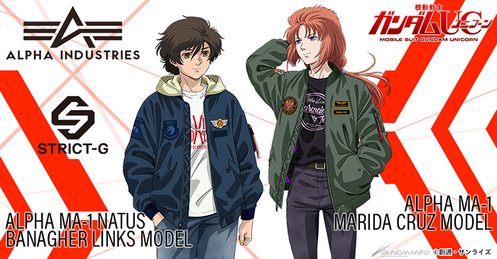 Les vestes en collaboration se déclinent en deux modèles inspirés deMobile Suit Gundam Licorne: le MA-1 NATUS à l’image de Banagher Links et le MA-1 à l’image de Marida Cruz.