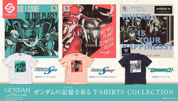 Les tee-shirts ont des conceptions à thème d’enregistrement vinylique inspirées de la séquence d’ouverture deMobile Suit SEED Gundam.