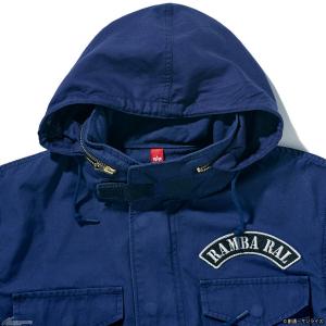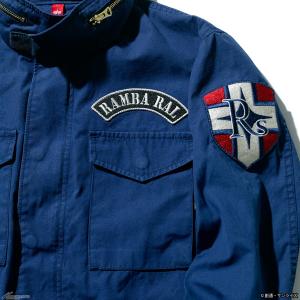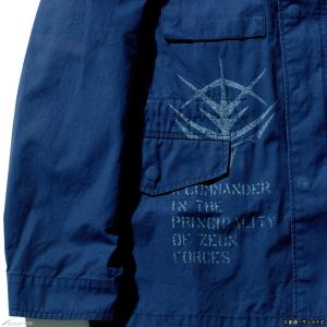 The Principality of Zeon Forces Ramba Ral Commando models have "PRINCIPALITY OF ZEON FORCES" embroidered patches on the left chest and a Zeon Forces patch on the left arm, while the Ramba Ral versions have "RAMBA RAL" embroidered patches on the left chest and a patch featuring Ramba Ral’s personal mark on the left arm. Both types have had stencil-like logos applied to their right pockets and the inside of the backs, reflecting the world of the series.