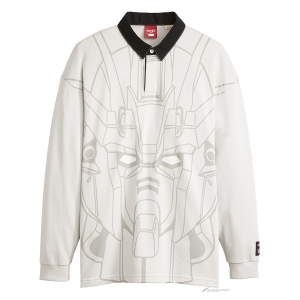 This light gray rugby shirt has a black cotton twill collar, a dynamic Strike Gundam print, and a jacquard jock tag.