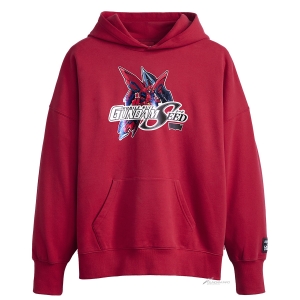 This hoodie has a shiny Aegis Gundam printed on the front of the chest. It has a jacquard patch on its left sleeve.