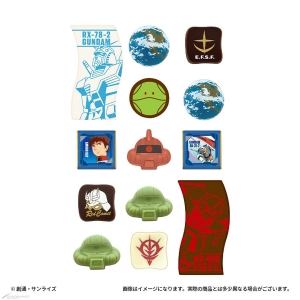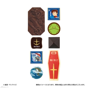 Chacun des emballages et chocolats présente des motifs de Mobile Suits et de personnages deMobile Suit GundametMobile Suit Gundam : Contre-attaque de Char. Cette gamme propose une sélection composée d’une boîte de chocolat, de canettes et d’une boîte.
