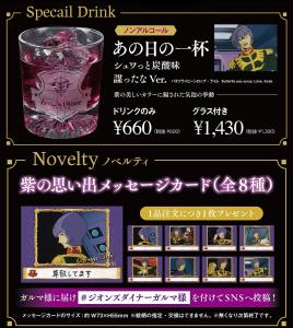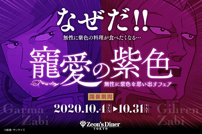 Cette foire sera organisée dans Zeon de dîner TOKYO, l’dîner basée sur l’expérience qui vous permet d’entrer le monde de la Principauté de Zeon.Il y aura des boîtes et boissons à usage exclusif en violet, Garma zabi, et il y aura également une « carte de message avec des souvenirs violets » disponible sous forme d’élément de fantaisie.
