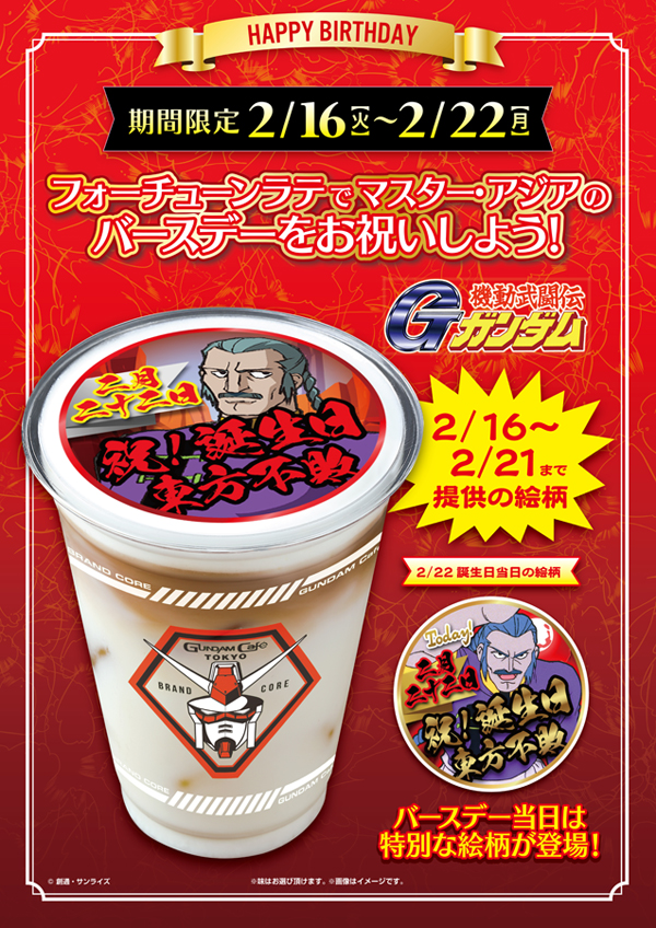 L’anniversaire de Master Asia FortuneLatte sera disponible au GUNDAM café et Gundam SQUARE pour une durée limitée à partir du 16 février !