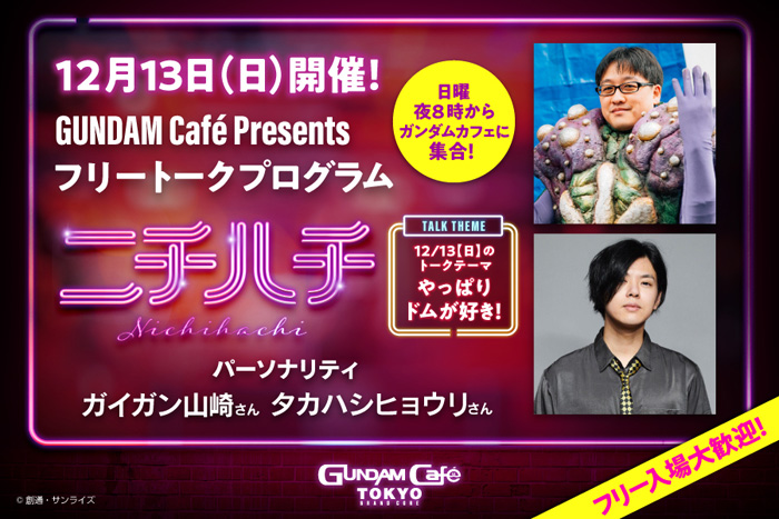 Détails sur le programme Talk gratuit Nichihachi, événement qui aura lieu à 8:00 PM le dimanche, treizième décembre à l’GUNDAM cybercafé TOKYO BRAND CORE (GUNDAM Coffee TOKYO) l’expérience de restauration basée sur des spectacles a été révélée.