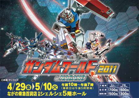 The Gundam exhibition 'Gundam World 2011 in Nagano' opens on April 29th, the first day of Golden week and runs until May 10th on the 5th floor of the Nagano Tokyo Department Store's Bekkan Chercher in Nagano Prefecture. Attractions include a life-size RX-78-2 Gundam torso to be photographed on, a series of dioramas covering