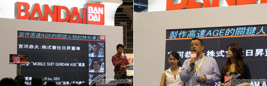 Displays of the Mobile Suit Gundam AGE trailer on the booth's stage drew quite a few viewers. After the showings, Executive Producer Miyakawa spoke about key points of the show. Many attendees dropped by to hear the latest about Gundam AGE.