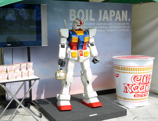 ▲ Nissin Foods plays the Boil Japan commercial at their stand. A 1/12 scale statue of Gundam hoisting the kettle is on display.