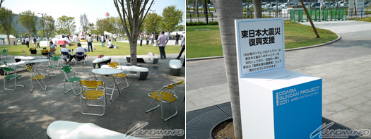 ▲ Seats and benches are provided for those wishing to enjoy Gundam from the cool shade. A donation box is available for earthquake victims, and a portion of the proceeds will go to rebuilding efforts.