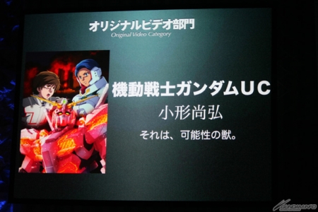 『機動戦士ガンダムUC』からは、サンライズ・小形尚弘プロデューサーが登壇し、「昨年に引き続き、この賞を頂きまして大変ありがとうございます。受賞作の中で、唯一のロボットアニメということで、勝手に誇りに思っております。制作現場は今、episode 5の完成に向けてラストスパートに入り、5月19日の上映・販売を目指して頑張っておりますので、ぜひ一人でも多くの方に観て頂けると非常に助かります。また来年も呼んでいただけるように、スタッフ一同頑張っていきますので、これからもよろしくお願いいたします。」とコメントした。