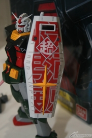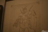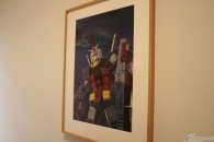 ▲展示会のポスターにも使用されている、半身の機構が露出する“内部図解”の「ガンダム」も展示されている。
