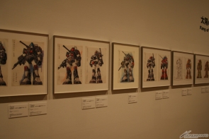 ▲『機動戦士ガンダム』の設定資料が並ぶコーナーでは多数のデザイン案が掲載され、馴染みの深いMSへと至るまでの過程を体感できる。