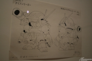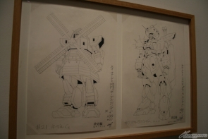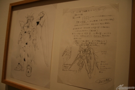 ▲ファンの記憶にも新しい『機動戦士ガンダムSEED』のコーナーでは、福田己津央監督のオーダーと、そこから生まれた「フリーダムガンダム」が並ぶ。さらには「ジン」や「バクゥ」の初期案といった貴重な資料も展示されている。