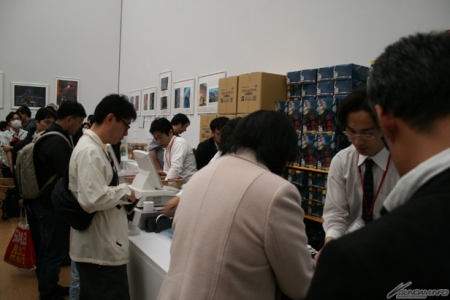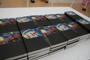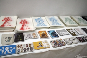 ▲多くの来場者が列を成す物販コーナーでは、「MG 1/100 ガンダム Ver.2.0 リアルタイプカラー 超・大河原邦男展Ver.」をはじめ、今回の展示物を一挙に収録した目録や、イベント限定のクリアファイルとポストカード、ザクIIを模したUSBメモリーなどファン垂涎のグッズが並ぶ。