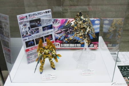 ▲イラストの他にもガンダムフロント東京で販売中の「HGUC 1/144 ユニコーンガンダム3号機 フェネクス(デストロイモード)Ver.GFT」や、同「リミテッドゴールドコーティング」(完売)も展示している。