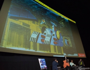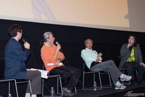 登壇したのは、板野一郎(アニメーション監督、劇場版三部作アニメーター)、関田 修(アニメーション監督、劇場版三部作フロアディレクター)、福井晴敏(作家、『機動戦士ガンダムUC』ストーリー担当)の3名。司会はアニメ特撮研究家の氷川竜介が務めた。