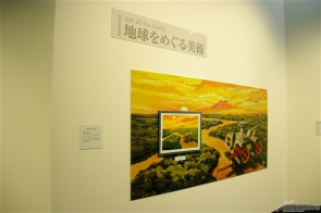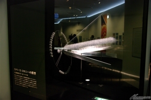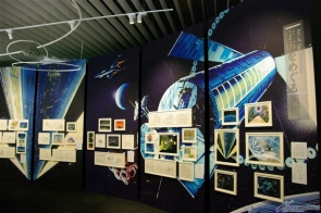 ▲「近未来の宇宙で」では、「スペース・コロニー」の模型や中村光毅氏の手による美術ボードなどで、宇宙空間やスペースコロニーの概念に迫る。