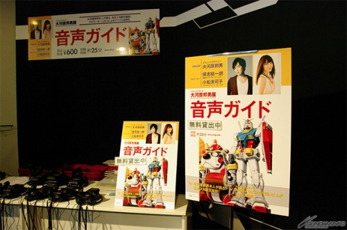 ▲音声ガイドには、大河原氏本人に加え、大河原メカに関わりが深い声優の保志総一朗氏と小松未可子さんが登場。貸出価格は600円(税込)。