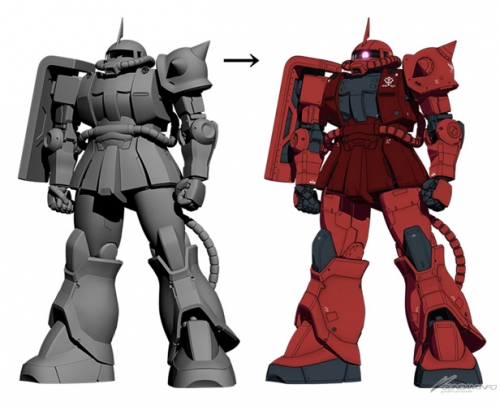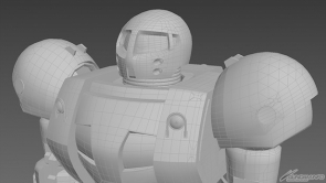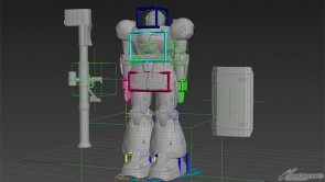 ▲モビルスーツのCGモデリングは、設定画を元にラフの形状を作成し、さらにディテールの形状、質感を作成していく。しかしこのままでは動かせないので、ある作業を加えていくことに…