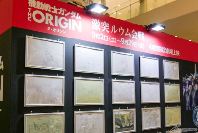 また、別の壁面には、大ヒット劇場上映中の『機動戦士ガンダム THE ORIGIN 激突 ルウム会戦』の原画も展示され、入場前から気分が盛り上がる。