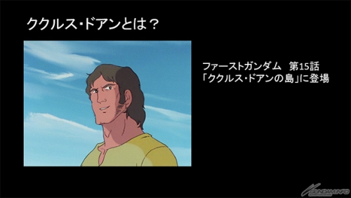 トークは「ククルス・ドアン」の紹介からスタート。アニメ『機動戦士ガンダム』のキャラクターだが、TVシリーズには登場するものの、劇場版3部作には登場しないので、今回おさらいを兼ねて改めて紹介することに。