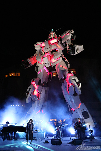 さらに、ステージには『機動戦士ガンダムUC』で主人公のバナージ・リンクスを演じる内山昂輝さんと、音楽を担当する澤野弘之さんとTielleさん、そしてSUGIZOさんがスペシャルゲストとして登場し、全身を発光させながら、ユニコーンモードからデストロイモードへと変形する姿とともに、実物大ユニコーンガンダム立像のテーマ曲となる書き下ろし新曲「Cage」を披露。SUGIZOさんによる「ビギニング」の独奏や、全員によるスペシャルメドレーの生演奏も行われ、盛大なセレモニーとなった。
