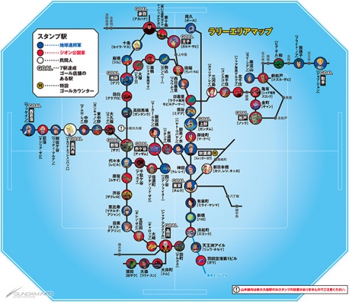 さらにダブルチャンスとして、「全駅制覇スタンプ」を押印した専用ハガキに必要事項を記入して応募すると、抽選で豪華オリジナル賞品をプレゼント。ダブルチャンスは「地球連邦軍賞」3名、「ジオン公国軍賞」5名の計8名となっている。