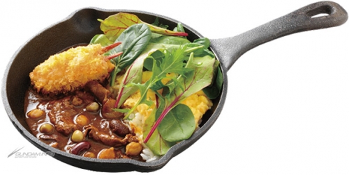 ベビーリーフでジャブローの熱帯雨林を表現。牛肉と豆入りのスパイシーなオムカレーに、カニ爪コロッケをオン。