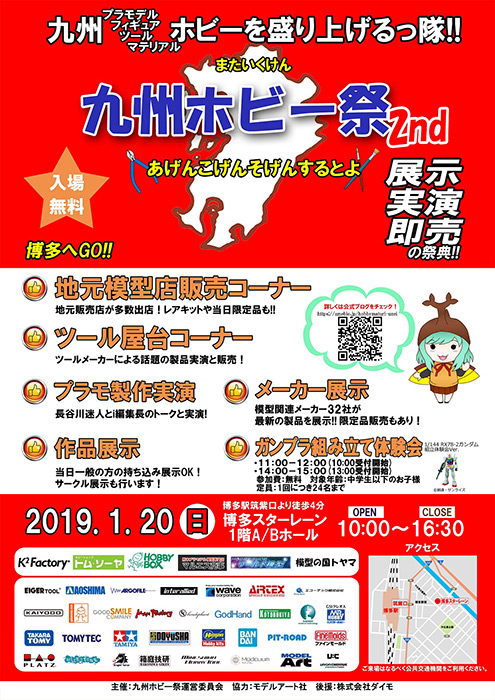 "Kyushu Hobby Festival 2e, l’événement dans le Kyushu qui célèbre des loisirs modèle et figure en plastique, aura lieu ce week-end, Le 20 janvier, 2019 (Sun) à Fukuoka à le Starlanes Hakata. L’entrée est gratuite