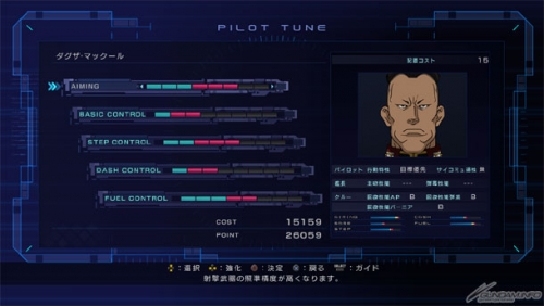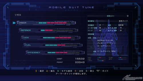 本作では、ゲーム中に手に入るポイントを使用し、MSだけではなくキャラクターや武装の強化が可能となっている。強化できる項目は以下の通りだ。