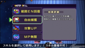 Master Skills are special abilities usable by leader units that can change the course of a battle with a single button press. Each character has their own ability like 'Move Twice' or 'Ally HP/EN Recovery', and can learn more as they level up! While these skills can only be used one at a time, returning to a ship lets you recharge, making effective ship management key to victory!