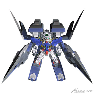 A mobile suit from Mobile Suit Gundam 00. Its Large GN Sword carves through close-up foes. Using its Large GN Cannon, ir can pick off enemies at a distance, making it good at all ranges. After its gear swap, it's far more maneuverable, but at the cost of weapons selection.