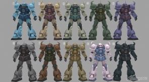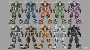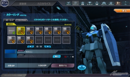 The Coloring option can now be chosen from your hangar's suit selection menu. Each color must be unlocked using the "Color Spray" material and a fixed GP sum.