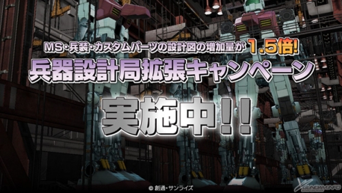 During this event MS plans, Weapon plans, and Parts plans all drop at 1.5 times the normal rate, making it easier than ever to build your arsenal.