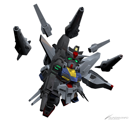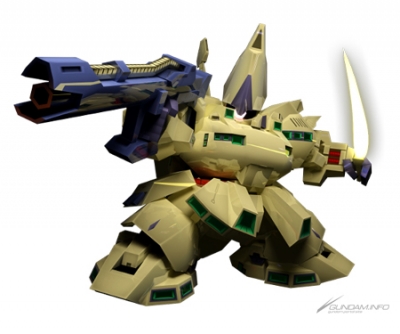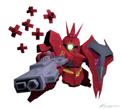 A mobile suit from Mobile Suit Gundam: Char's Counterattack. Before weapon swap, this suit has only ranged weapons, and relies on its Funnels and multi-target Torso Mega Particle Gun.