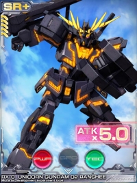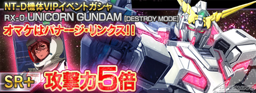 「NT-D機体VIPイベントガシャ」は、その名の通りスペシャルなガシャで、中には 高い攻撃力倍増ボーナスを持つ強力な「特効カード」が含まれている。攻撃力2倍の「リゼル隊長機」や攻撃力2.5倍の「アンクシャ」などがあるが、とりわけ 攻撃力5倍の「ユニコーンガンダム(デストロイモード)」は、セットで 攻撃力3倍の「バナージ・リンクス」が付いてくる超お得なカードだ。
