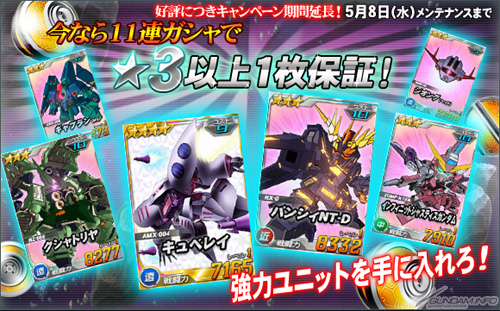 The One Three-star Card per 11 Gasha Tries Guarantee will continue through May 8th.