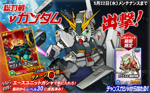 From noon May 8st through May 22nd, players can encounter the νGundam in a super group battle. Take on missions over the next two weeks for a chance to encounter it.