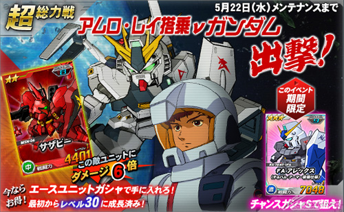 「アムロ搭乗νガンダム」を倒した際に引くことができるチャンスガシャSには、「FAアレックス(チョバム・アーマー装備仕様)」を獲得できるチャンスがあるほか、エースユニットガシャには「アムロ搭乗νガンダム」に対し6倍の攻撃力を発揮する「サザビー」が追加される。