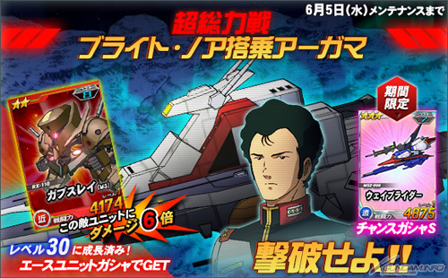 「ブライト・ノア搭乗アーガマ」を倒した際に引くことができるチャンスガシャSには、「ウェイブライダー」を獲得できるチャンスがあるほか、エースユニットガシャには「ブライト・ノア搭乗アーガマ」に対し6倍の攻撃力を発揮する「ガブスレイ(MS)」が追加される。