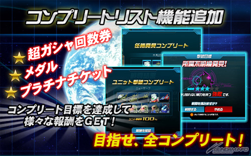「コンプリートリスト機能」とは、既存の撃破コンプリートなどの状況をまとめて閲覧できるだけでなく、新たなコンプリート要素達成に応じて報酬が得られる機能。追加された要素を達成すると、「プラチナチケット」や「メダル」など、豪華な報酬を手に入れることができる。