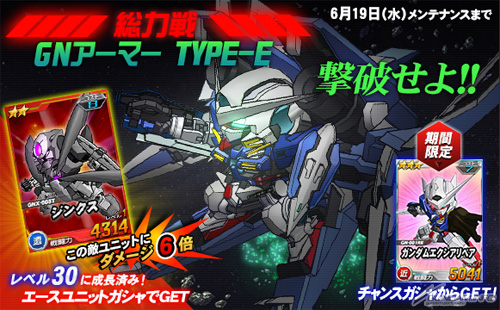 From noon June 5th through June 19th, players can encounter the GN Armor Type-E in a group battle. Take on missions over the next two weeks for a chance to encounter it.