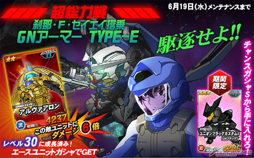 「刹那搭乗GNアーマーTYPE-E」を倒した際に引くことができるチャンスガシャSには、「ユニオンフラッグカスタムII(GNフラッグ)」を獲得できるチャンスがあるほか、エースユニットガシャには「刹那搭乗GNアーマーTYPE-E」に対し6倍の攻撃力を発揮する「アルヴァアロン」が追加される。