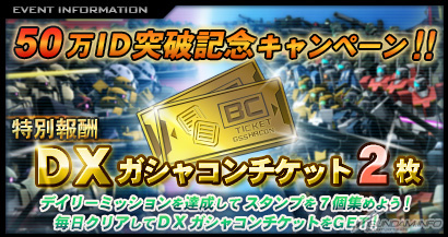 詳しくは「機動戦士ガンダムオンライン」公式サイトの 「50万ID突破記念キャンペーン」特設ページをご覧ください。