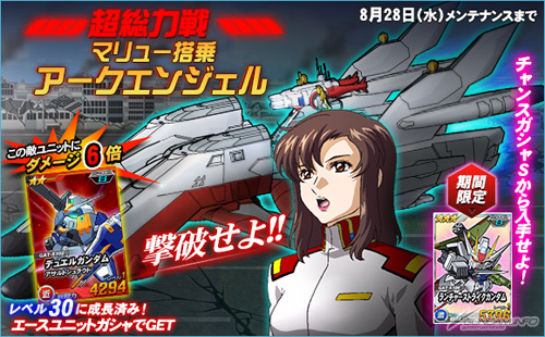 「マリュー搭乗アークエンジェル」を倒した際に引くことができるチャンスガシャSには、「ランチャーストライクガンダム」を獲得できるチャンスがあるほか、エースユニットガシャには「マリュー搭乗アークエンジェル」に対し6倍の攻撃力を発揮する「デュエルガンダム アサルトシュラウド」が追加される。