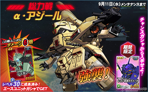 「α・アジール」を倒した際に引くことができるチャンスガシャには、「レズン専用ギラ・ドーガ」を獲得できるチャンスがあるほか、エースユニットガシャには「α・アジール」に対し6倍の攻撃力を発揮する「ジェガン」が追加される。